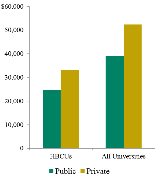 While HBCU’s constitute fewer than 5% of U.S. institutions of higher learning, they account for almost one-fifth of the bachelor’s degrees earned by African Americans and nearly one-quarter of the bachelor’s degrees earned by African Americans in Science, Technology, Engineering and Math.4 Notably, HBCUs have achieved this success while spending less per student than U.S. universities overall (see chart below).5